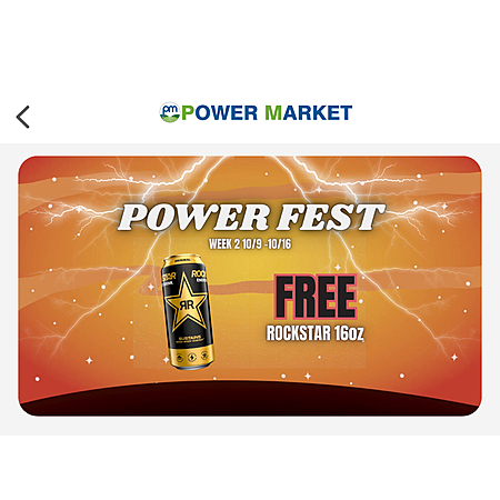 Power Market, convenience store, is offering Free 16 oz Rockstar Energy Drink through their Power Market app. It's a part of a weekly Free item that they are offering in October called Power Fest. Each week is a different item. Just have to download the app to be a rewards member and redeem in store. Sign up is free.