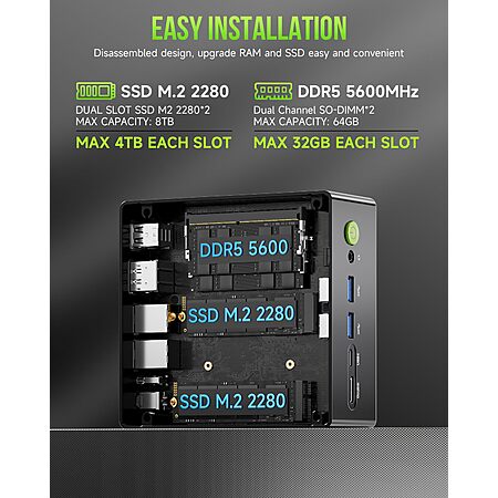 32GB DDR5 + 1TB PCIe 4.0 SSD - GMKtec K11 mini computers comes with 32GB(dual-channel) DDR5 RAM at 5600 MT/s , which can be expanded to 128GB and 1TB PCIe 4.0 M.2 2280 SSD supports dual PCIe Gen4 x4 SSD slots expanded up to 8TB, ensures lightning-fast read/write speeds