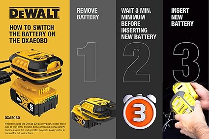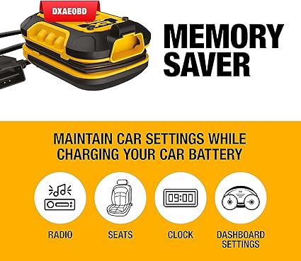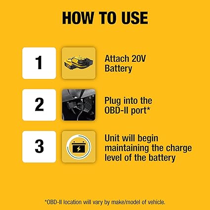 It plugs in to your OBD port and maintains your vehicle battery via a Dewalt 20-volt battery.