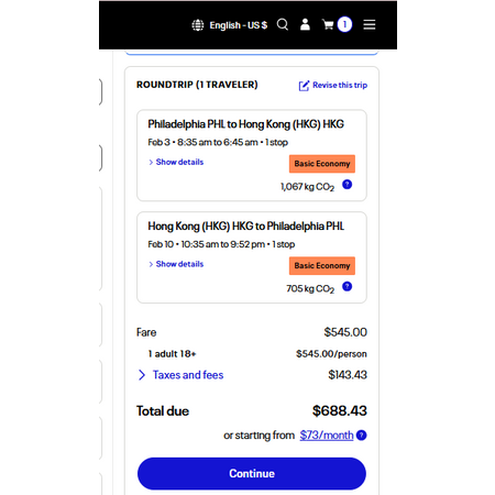 United Airlines and Expedia have round trip airfares travelling from Philadelphia (PHL) to Hong Kong (HKG) for $689, making 1 or 2 stops both ways.  If you choose 1 stop, the layover will be longer.  For 2 stops, it'd be shorter at each layover.  These are basic economy fares that allow a personal item, a carry-on bag and 1 free checked bag.  There is no seat selection and no change.  If you are travelling with children, you will be seated together as per UA's policy.
