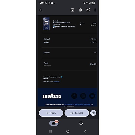 Lavazza has 2.2-lbs Lavazza Super Crema Whole Bean Coffee (Medium Roast) on sale at 7 for $174.86 - $69.93 when you log in to your account and apply promo code 40FALL in cart - $10 ($10 off $99+ savings) = 7 for $94.93. Shipping is free.