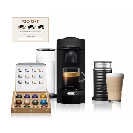 • Includes VertuoPlus Deluxe coffee and espresso maker, frother, three sleeves of pods, and $20 Nespresso voucher