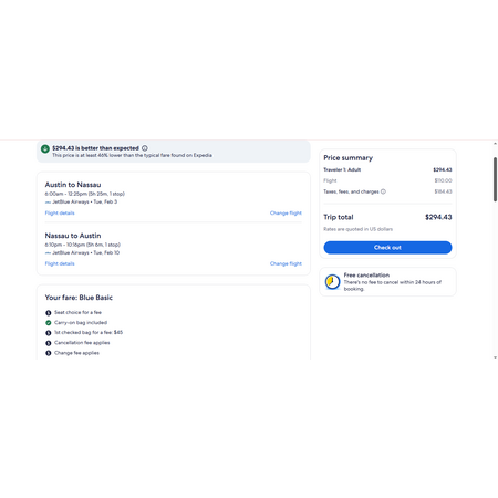 JetBlue, American Airlines and Expedia have round trip airfares travelling from Austin TX (AUS) to Nassau Bahamas (NAS) for $295, making 1 stop both ways These are basic economy fares that allow a personal item and a carry-on bag. There is no seat selection and no change. If you are travelling with children, you will be seated together as per JetBlue and AA's policy.