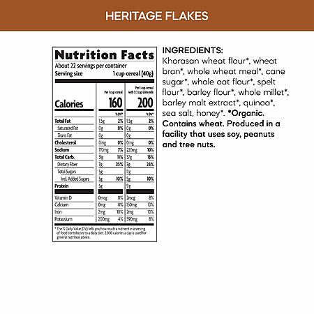 - Ancient grain cereal flake, organically sweetened, and lightly flavored with sea salt and honey for a rich, nutty and wholesome taste