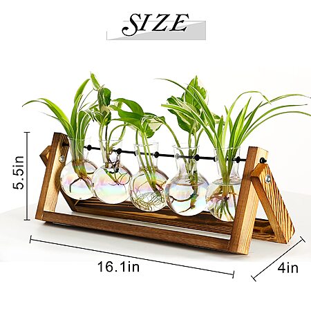 - ✿Size: The wooden stand size: 5.5"H x 15" W & 4.7"H x 16" W; Each vase: 4.02 H x2.56 W; Opening: 1 inch diameter. Longer wooden frame, 5 glass bulb vases, can plant more plants and more eye-catching.