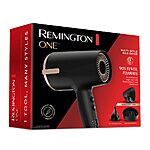 - The REMINGTON ONE Multi-Style Ionic Hair Dryer is designed to make at-home hair styling easier faster and more precise. This lightweight hair dryer features a 50% shorter barrel for improved control and a 15% lighter design for more comfortable use. It comes with three styling attachments to meet different needs: a Flyaway Tamer to smooth frizz and loose strands a Curl Diffuser that helps define curls while drying quickly and a Styling Concentrator for targeted airflow and precise results. The advanced ionic technology helps reduce frizz by up to 90% leaving hair smoother and shinier. With four heat settings two speed options and a cool shot button you can easily customize your styling routine. The REMINGTON ONE Multi-Style Ionic Hair Dryer also includes a hang loop a cord wrap strap and a 6-foot cord for flexible use and easy storage. It s a reliable user-friendly tool that helps you achieve salon-style hair at home.