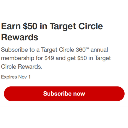 Subscribe to a Target Circle 360™ annual membership for $49 and get $50 in Target Circle Rewards.