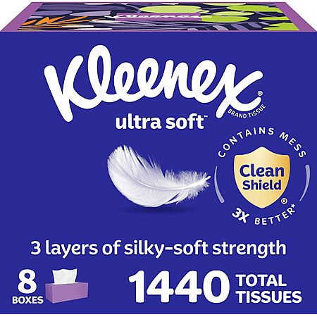 Kleenex Ultra Soft Facial Tissues, 8 Flat Boxes, 180 Tissues per Box, 3-Ply $12.29