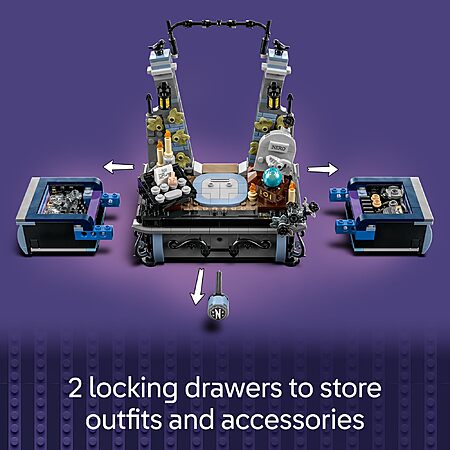 - MYSTERY PLAYSET WITH SECRET ACCESSORIES – Includes a brick-built figure of Wednesday with 2 face and outfit options, Thing character, a stand with 2 secret lockable drawers and various accessories