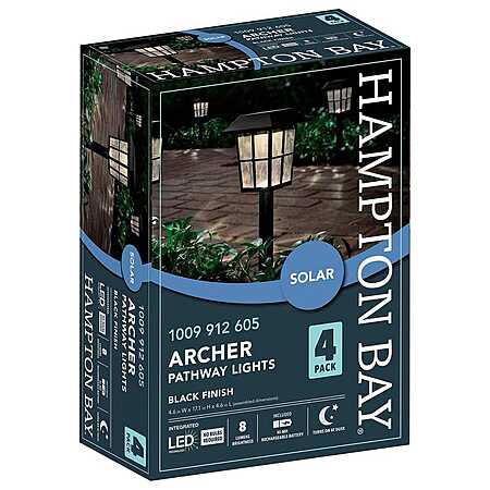 The Hampton Bay Archer solar path light 4-pack is an easy way to brighten your landscape. With no wiring necessary, these lights install in seconds and the integrated LED means maintenance free operation for vears. This light automatically turns on at dusk and stays lit for up to 8-hours when fully charged. These lights are the perfect solution for illuminating pathwavs. walkways and entrancewavs. Each light produces 8 Lumens when fully charged. Color: Black. Material: Plastic.