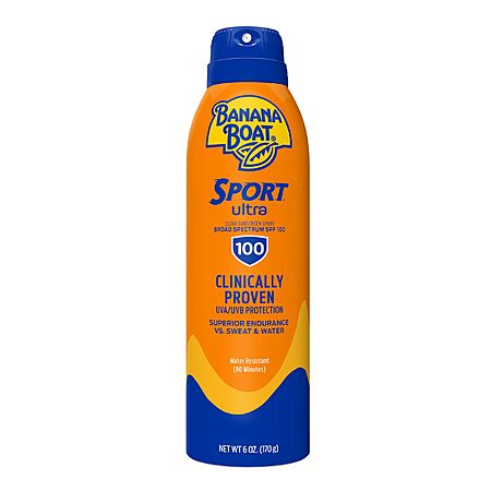 - Great for your active lifestyle! Banana Boat Sport Ultra Clear Spray Sunscreen provides powerful, reef friendly protection that absorbs quickly, is non-greasy and won't run into your eyes. These lightweight, clear sprays protect against 99% of burning rays and are designed especially for sport enthusiasts and other active individuals who need sport-strength sun protection that doesn't play around! Banana Boat Sport Ultra Clear Spray Sunscreen has superior endurance versus sweat and water and will last as long as the fun does*! *Reapply this safe and effective broad spectrum UVA and UVB protection as directed on the product label. Protect the fun on earth with Banana Boat! Superior Endurance VS. Sweat & Water - from family fun to hardcore competition, our sunscreen provides strong sun protection that stays on so you can play on.; Clinically Proven Uva/Uvb Protection - protects against 99% of burning rays.; Lightweight, Breathable Formula - non-greasy feel won't weigh you down.; High-Performance Sunscreen - water & sweat resistant for up to 80 minutes.; Lasts AS Long AS THE FUN Does - reapply as directed on the product label.; This item may be eligible for FSA and HSA reimbursement. For any questions you may have regarding FSAs or HSAs, please browse our Faq.;