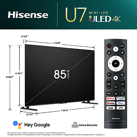 85" Hisense U7 Series Mini-LED Dolby Vision 4K Google Smart TV $998 + Free Shipping