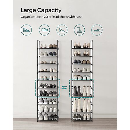 - As Flexible as You Want: A 10-tier shoe organizer or two 5-tier racks? You can set up the shoe rack either way you like. In addition, you can remove 1 or 2 shelves to fit shoes of varying heights