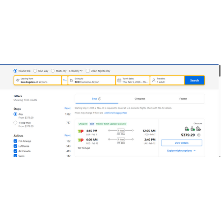 TAP Air Portugal via Booking.com have round trip airfares travelling from Los Angeles (LAX) to Rome Italy (FCO) for $380, making 1 stop in Lisbon both ways for 1-3 hours. These are economy lite fares that allow a personal item and a carry-on bag. There is no seat selection and no change.