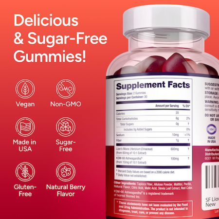 Model: Sugar Free Lions Mane Supplement Gummies with KSM-66 Ashwagandha - Nootropic Supplement for Cognition, Brain Fog, Mental Clarity, Focus & Stress Support - Natural Berry Flavor, Vegan, Made in USA
