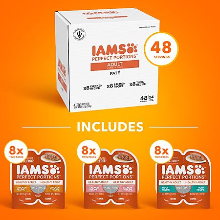IAMS Perfect Portions Adult Wet Cat Food Pate, Chicken, Salmon, and Tuna Recipe Variety Pack, 2.6 oz. (24 Count, 48 Servings) $18.49 after $10 Clip Q and S&S