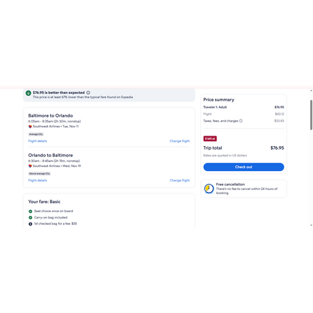 Southwest Airlines and Expedia have round trip airfares travelling to and from Baltimore MD (BWI) and Orlando FL (MCO) for $77, nonstop. These are basic economy fares, a restricted-type fare that allows a personal item and a carry-on bag. There is no seat selection and no more free checked bags on Southwest.