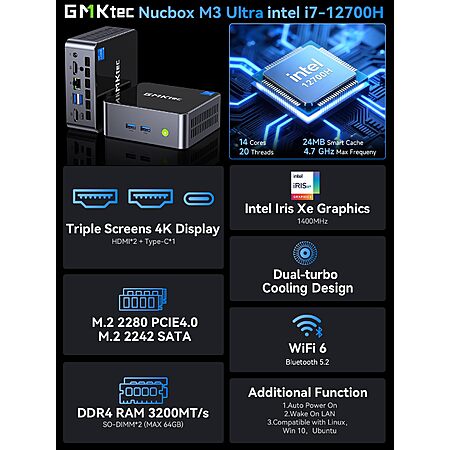 GMKtec M3 Ultra Mini PC with Intel Core i7-12700H(14C/20T 4.7 GHz), 32GB DDR4 RAM+2TB NVMe SSD, Mini Desktop Computer Triple 4K Display, WiFi 6, BT5.2, USB-C $489.99