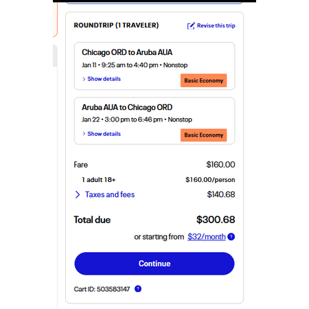 United Airlines have round trip airfares travelling from Chicago (ORD) to Aruba (AUA) for $301, nonstop. These are basic economy that only allow a personal item. There is no seat selection, no carry-on bag and no change. If you are travelling with children, you will be seated together as per UA's policy.