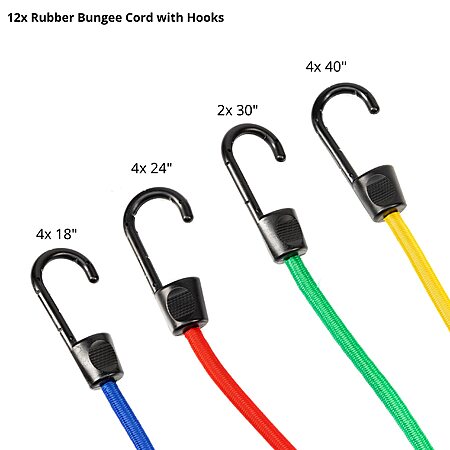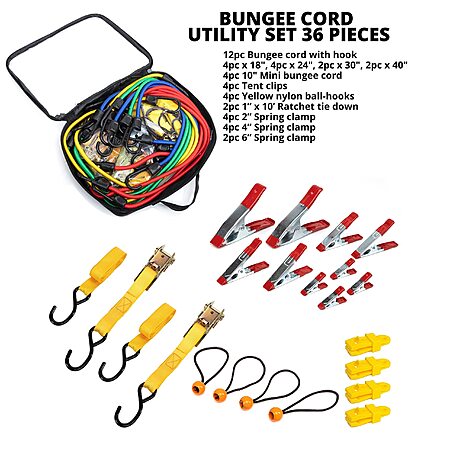 Model: TOOLUXE 50888L Bungee Cords Kit, 36pc Assorted Bungee Cord Hooks Set, Large & Small Loop Rope with Hooks, Outdoor Canopy Ties, Ratcheting Straps, Steel Spring Clamps, Plastic Alligator Tarp Clips