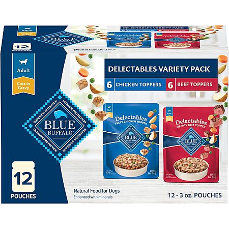 12-Pack 3-Oz Blue Buffalo Delectables Natural Wet Dog Food Toppers (Chicken & Beef Variety Pack) for $12.31 - $1.85 when you