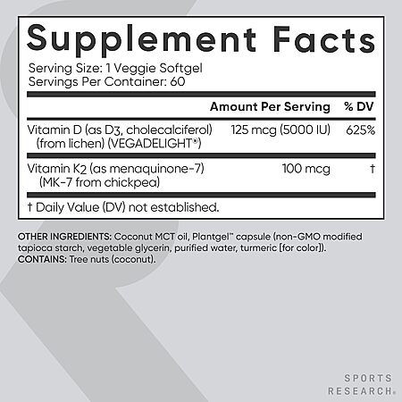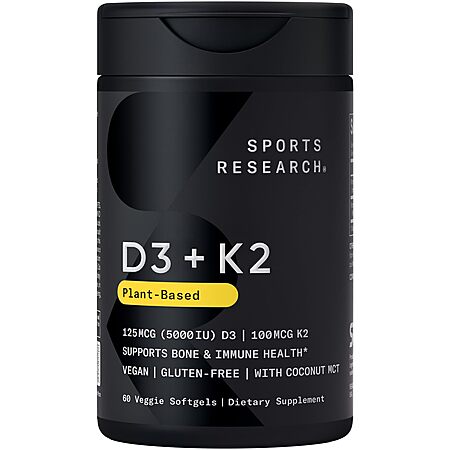 Sports Research® Vitamin D3 + K2 w/ Coconut Oil Vegan Certified 60 Softgels $15.09