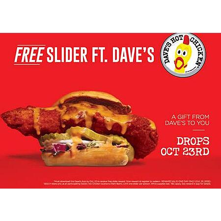 Just download the Dave's app, swing by any daveshotchicken location on Thursday, 10/23, and scan the reward to redeem your slider.