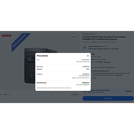 Ecoflow eBay official store has Refurbished Ecoflow Delta 2 Max (2kWh) on sale $873.75 - 25% using code