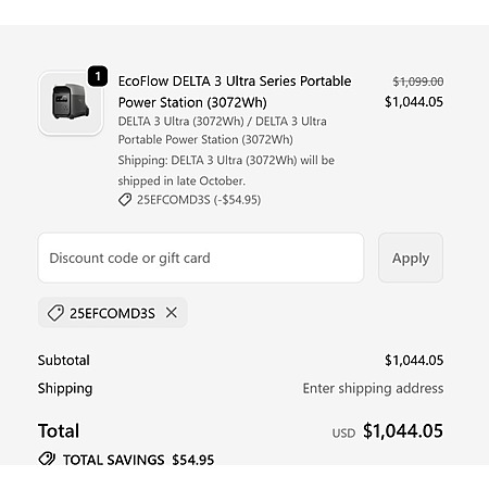 3072Wh EcoFlow Delta 3 Ultra LiFePO4 4600W X-Boost Portable Power Station for $1099 - $54.95 when you apply discount code