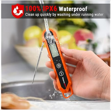 Completely waterproof: The food thermometer has a IPX6 waterproof rating that means you can wash the unit under running water without fear. The instant read thermometer ensures cleanup is Ultra-fast