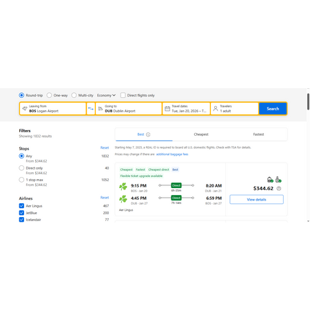 Aer Lingus via Booking.com have round trip airfares travelling from Boston (BOS) to Dublin Ireland (DUB) for $345, nonstop. These are economy lite fares that allow a personal item and a carry-on bag. There is no seat selection and change for a fee.