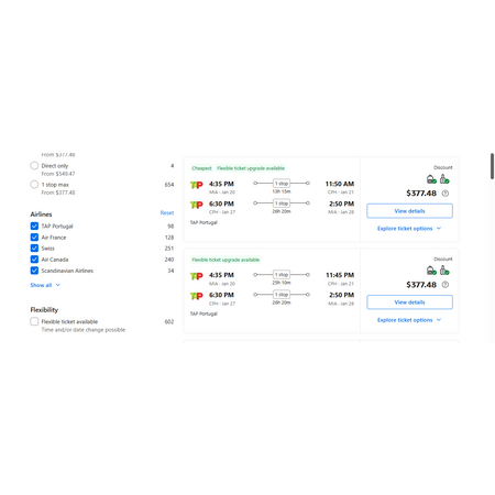 TAP Air Portugal via Booking.com have round trip airfares travelling from Miami (MIA) to Copenhagen Denmark (CPH) for $378, making 1 stop in Lisbon both ways for 1-3 hours. These are economy lite fares that allow a personal item and a carry-on bag. There is no seat selection and no change.