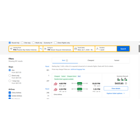 China Airlines via Booking.com have round trip airfares travelling from Phoenix (PHX) to Taipei Taiwan (TPE) for $658, nonstop. These are economy fares that include a personal item, a carry-on bag and 2 free checked bags. This is a new nonstop service.