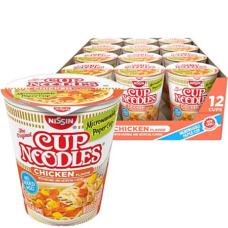 Nissin Cup Noodles Ramen Noodle Soup, Chicken, Microwaveable Paper Cup, 2.25 Ounce (Pack of 12)~$4.22 With S&S @ Amazon