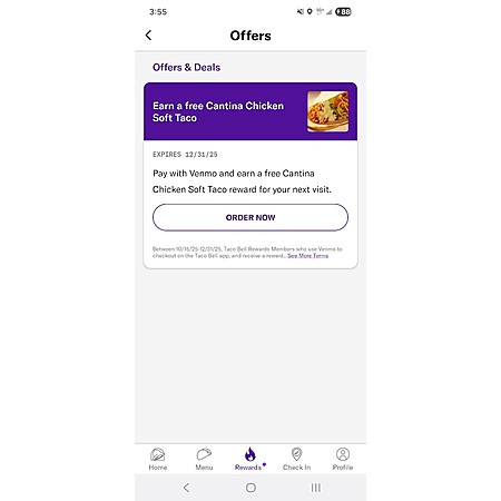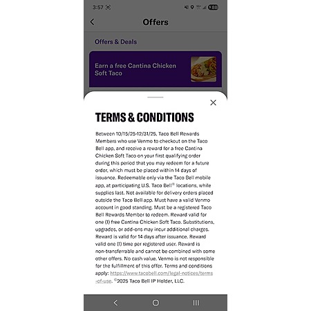 I have an offer in my TacoBell app to earn a free Cantina Chicken Soft Taco if I pay with Venmo from 10/15/25-12/31/25
