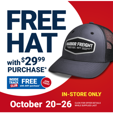 Harbor Freight, 10/20 - 10/26, FREE hat with any purchase for ITC members, non-ITC members receive hat with $29.99 purchase