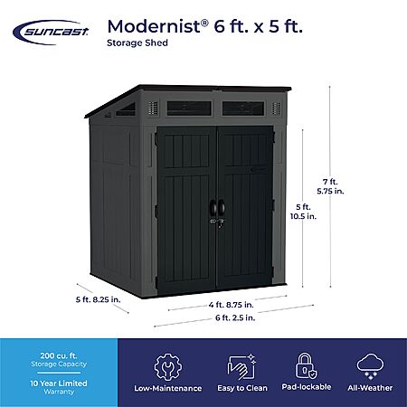 Lowes [lowes.com] has Suncast 6' x 5' Modernist Black Lean-to Resin Storage Shed (Floor Included) on sale for $499 with free store pickup.