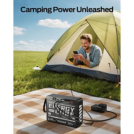- 70000mAh Camping Power Bank - The high capacity portable charger provides more than 14 full charges for iPhone 16, about 9 full charges for Android phone.The long-lasting large battery pack keeps the power for multiple days, making it perfect for travelling, hiking, outdoor camping fishing and more outdoor activities (Note: This big power bank NOT allowed on plane)