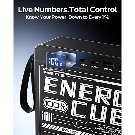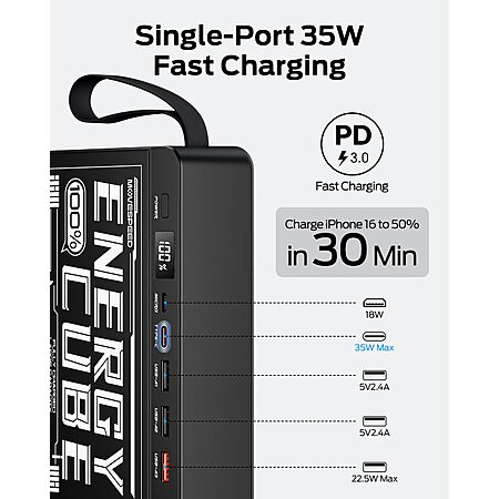 - 35W Two-Way Super Fast Charging, Support PD3.0 & QC3.0 - With the powerful 35W input/output, the charging speed of Energy Cube, will charge your iPhone to 56% in 30 minutes. This emergency power bank with large capacity will provide essential backup when you need it most