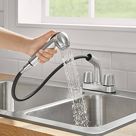 Model: 4 in. 2-Handle Centerset Pull-Out Laundry Faucet in Stainless Steel