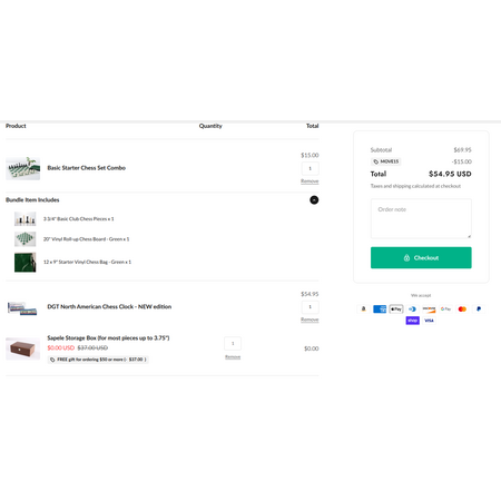 ALTERNATE $55 CHESS TOURNAMENT DEAL: If you stack some promos at ChessHouse.com you can get a free chessman storage box with $50 purchase, use MOVE15 code for $15 off, and get a tournament board, chessmen, bag combo deal.