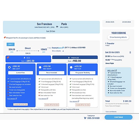 One Way SFO to ORY by French Bee $285.5 for selected dates in October 2025
