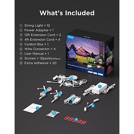 Model: Govee Permanent Outdoor Lights Prism, 200ft with 72 Triple-Color Lighting Heads, 100+ Scene Modes, Up to 60lm for Outdoor Decor, IP68 Waterproof, Works with Alexa, Google Assistant & Matter, White