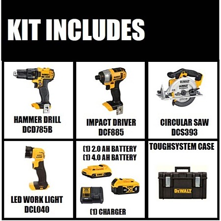 The DCKTS425D1M1 20-Volt MAX Lithium-Ion 4-kit (4 Ah) with a Tough System features our DCD796 20-Volt MAX XR Lithium-Ion Brushless Compact Hammer drill Kit which is lightweight and compact for working in tight spaces for long periods of time. The DCF885 20-Volt MAX Lithium-Ion 1/4 in. Impact Driver is compact and lightweight for fitting in tight spaces and increasing productivity. The DCS393 20-Volt MAX Circular Saw, features a Brushless motor which provides 5200 RPM maintaining speed under load. The DCG412 20-Volt MAX XR Lithium-Ion 4-1/2 in./5 in. Grinder increases productivity with features like Quick-Change wheel release, convenient trigger switch with lock-off button and extended run-time battery. It includes a Tough system with wheels, which features durable and thick structural foam walls, integrated water seal and rust-resistant metal latches.