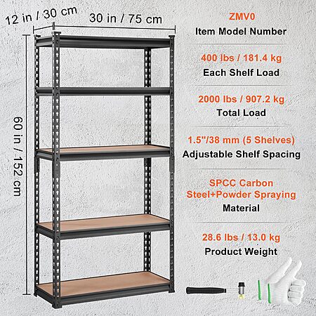 $38:VEVOR Storage Shelving Unit, 5-Tier Adjustable, 2000 lbs Capacity, Black, 30" L x 12" W x 60" H