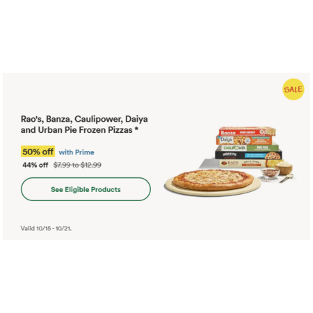 Whole Foods 50% offwith Prime Rao's, Banza, Caulipower, Daiya and Urban Pie Frozen Pizzas $6.5
