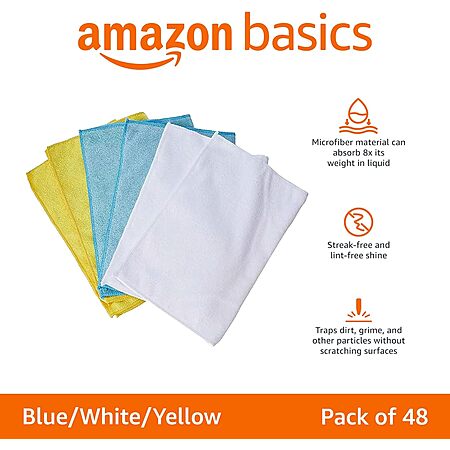 Amazon Basics Microfiber Cleaning Cloths, Non-Abrasive, Reusable and Washable, Pack of 48, Blue/White/Yellow, 16" x 12" $10.66