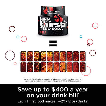 Product Description: | Meet the Ninja Thirsti Drink System, WC1000. Personalize flavor and fizz to create thousands of still and sparkling drinks at the touch of a button. Customize your drink by 25+ flavors, 2 flavor strengths, 2 fizz levels, and 4 drink sizes. Dispense directly into your favorite cup or bottle. Includes CO2 Canister and a variety of Flavored Water Drops. Enjoy a single flavor or combine two flavors to create your signature drink. Ninja Thirsti Drink Maker- Still & Sparkling Custom Drink Kit with CO2 Canister, Flavors, & 48oz Reservoir,WC1000 CUSTOMIZE & CREATE: Easily personalize your fizz, function, flavor, flavor intensity, and drink size with any cup or bottle. SPARKLING OR STILL: Select still or choose between two sparkling levels. FILL ANY CUP: Four different size settings, including 6oz, 12oz, 18oz and 24oz to be filled into any cup or bottle. FLAVOR: Select a flavor and flavor intensity OR keep it unflavored. MIX & MATCH: Combine any two flavors to create something new. EXPLORE ENDLESS FLAVORS: Choose from 25+ bold and unique flavors to make zero soda, fruit-flavored water, and seltzer (all 0 calories, 0 sugar per 12oz serving). CO2 MADE SIMPLE: Easy-to-install canisters. The Ninja Thirsti Drink System is designed for use EXCLUSIVELY with the Ninja Thirsti 60L CO2 Canisters to provide more efficient carbonation vs. leading competitors. Using other competitor CO2 canisters in the Ninja Thirsti Drink System may not be compatible or safe. LESS WASTE: By replacing single-use plastic bottles for the Ninja Thirsti, you can save up to 1,000 plastic bottles over the course of the year. INCLUDES: Ninja Thirsti Station, 48oz Removeable Temperature Sensitive Water Reservoir, 60L CO2 Cylinder, Variety of Flavored Water Drops |