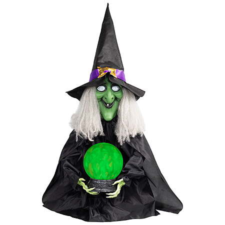 Create a "spooktacular" display this Halloween with this fortune-telling witch. She will frighten everyone she encounters as she sees their future in her magic ball. It is a perfect addition to any haunted house or as part of your home and office decorations! Magic ball lights up blue, green and purple. Makes a bubbling sound. Green skin witch dressed in a black robe with hat.