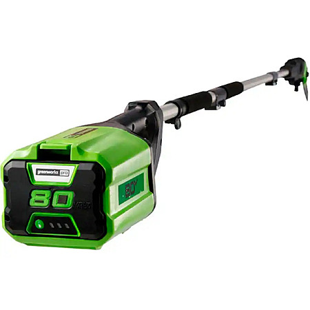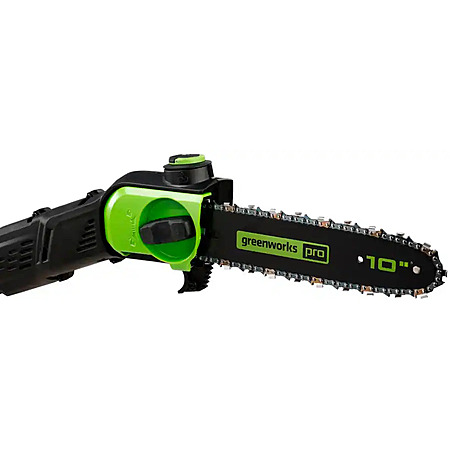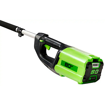 • Trim high limbs with ease with the Greenworks 80V battery-powered pole saw. With up to 83 cuts on a single charge, this lightweight, quiet-running saw features chain speeds up to 32.15 ft/s for fast cuts with no bogging down. With hassle-free, trigger starts, youll get to work fast, with no priming, no choke, and no pull cord; plus, battery fully recharges in just 30 minutes. Greenworks exclusive Intelligent Power combines TRUBRUSHLESS motor technology, lithium-ion battery power, superior cutting, and ultra-fast control systems for power output equivalent to a 25cc gas-powered motor.